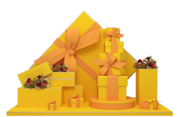 一个堆叠的礼品盒组合,包含四个主要礼盒和几个金色装饰球。最大的礼盒是红色的,带有金色缎带和蝴蝶结,位于堆叠的后方中央。其右侧是一个米黄色礼盒,配有红色缎带和较大的蝴蝶结。前方左侧是一个米黄色礼盒,带有红色缎带和蝴蝶结。前方中央是一个倾斜的红色礼盒,带有金色缎带和蝴蝶结。右侧前方是一个较小的红色礼盒,带有金色缎带。几个金色的圆形装饰球散落在礼盒周围,增添节日气氛。整体构图饱满,礼盒之间有前后层次,色彩以红色和金色为主,营造出喜庆、欢快的氛围。