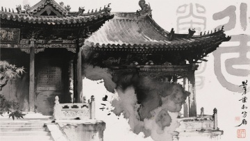 水彩插画风,清新古典,绿树掩映古桥,江南水乡韵味。