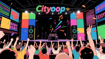 潮流感十足的夜市街景,2D与3D混搭风格,卡通拟人角色互动,霓虹灯与塑料质感结合,营造出充满促销氛围的软3D视觉体验。