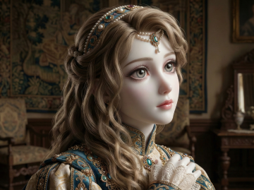 人物写实风格:“中晚唐云髻,超高耸发髻(约一尺二寸),如‘云堆’蓬松隆起,顶部圆润饱满,发丝分层堆叠显厚重感;髻顶插大型金饰(镂空缠枝莲纹,嵌红绿宝石),两侧垂金色花朵垂饰(牡丹形,花瓣层叠);身着绛紫色大袖襦裙(纱质轻盈,裙摆拖地三尺),肩搭杏色大帔帛(边缘镶貂毛);背景为晚唐贵族府邸(琉璃瓦、屏风绘山水),烛火摇曳中发髻投下阴影;色彩浓郁(绛紫、金、红为主),发丝蓬松如云,8K细节,富贵逼人。””