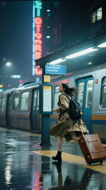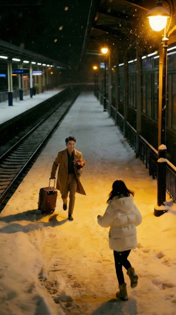 女生穿白色马海毛毛衣,粉色围巾绕颈,老式火车背景。上宫格:大特写镜头,女生脸部特写,车厢暖光从头顶灯处洒下,发丝发光,眼神带点旅途的憧憬,嘴唇微抿。下宫格:中景镜头,女生坐在老式火车窗边,手贴在车窗上看外面雪落,发丝被风(车窗缝)吹起。中间有大片雪花图标元素衔接。