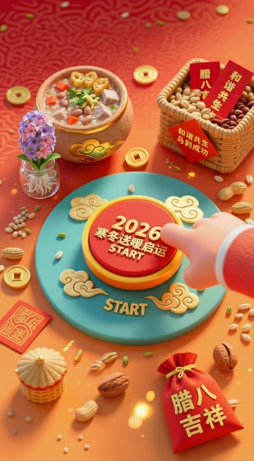国潮风融合重拟物与鎏金浮雕,红金主色营造喜庆奢华氛围,腊八粥热气氤氲,搭配中国结与灯笼,尽显中式复古年味。
