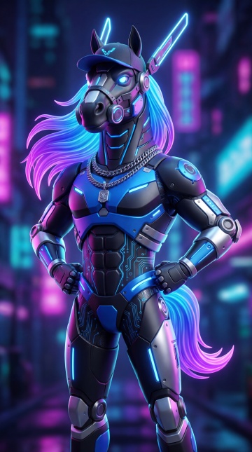 赛博朋克风拟人马,身披金属质感机甲,霓虹蓝紫光效流淌,未来科技与酷炫机能融合,城市夜景为背景,尽显前卫潮流。