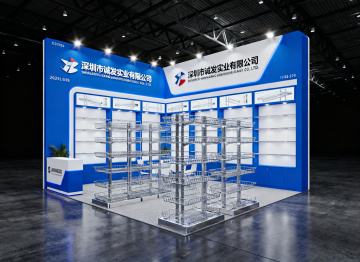 一个现代简约风格的展台设计,展台主体为几何形态的白色立方体展示台,带有简洁的分层结构,放置在一个明亮的空间内。背景保留大面积的白色墙面,墙上有由窗户投射进来的清晰几何阴影图案,地面为光滑的反光材质,整体空间干净通透。采用深蓝色与浅灰色的配色方案,展台边缘有细微的蓝色线条勾勒,墙面局部有浅灰色的渐变处理,光线柔和,营造出专业、冷静的氛围。设计注重留白和视觉层级,整体简洁大方,符合现代产品展示的需求,没有多余装饰元素,信息传达高效直接。