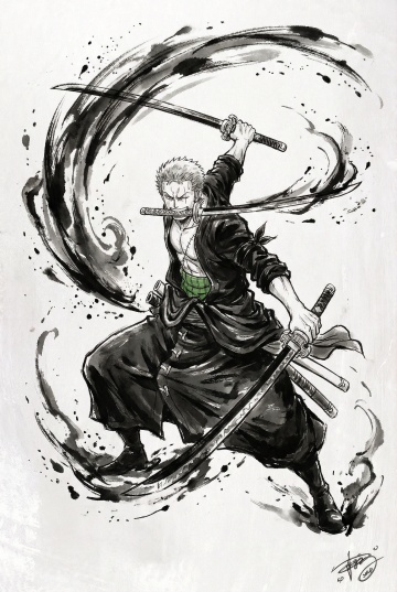 画面中有许多经典索隆场面呈螺旋状排列,主人公草帽一伙在旋转的海报中行走。固定聚焦在他身上,周围呈现朦胧模糊、涂抹、拖影的效果。