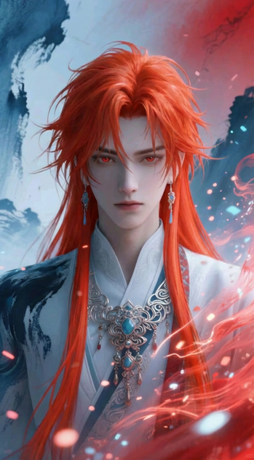 在温馨柔和的氛围下,逆水寒风格二次元花美男插图。画面聚焦于主体——拥有一头俊酷飘逸的长发,头发上有个金属光闪闪的发簪。男孩身着白色流沙飘逸的长袍,手里拿着古风扇子,扇子上写有有财鎏金大字。古风