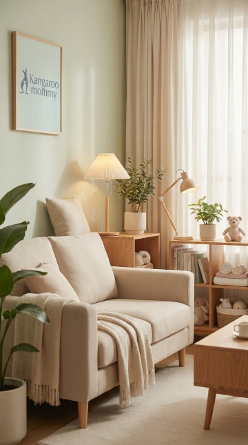 温暖柔和的奶油风客厅,米白色布艺沙发搭配多个浅色抱枕,沙发前铺有浅米色地毯,木质地板自然舒适。沙发背景墙为米黄色,墙上挂着一幅带有棕色相框的风景画,画中是柔和的海景。沙发上方的置物架上摆放着一盆绿植、一个几何纹路陶罐、一个复古黄铜座钟和一盏黑色金属台灯,置物架左侧矮台上有一个粉色陶瓷花瓶,旁边的小桌上放着几本翻开的杂志。整体采用低饱和度的暖色调,光线柔和,通过侧光营造出温馨静谧的氛围,光影层次丰富,具有简约而不失格调的日式侘寂风美感,空间布局通透,物品摆放错落有致,充满生活气息。