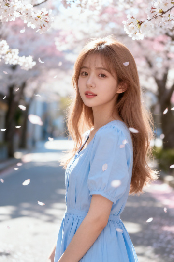 一位年轻女子的上半身特写,她有着棕色的长直发,刘海整齐地垂在额前,发丝被风吹起,显得轻盈飘逸。她穿着一件浅色的针织开衫,内搭白色的衣服,嘴角微微上扬,眼神温柔而清澈,带着一丝腼腆的微笑。她的右手轻轻搭在开衫的肩带上,姿态自然放松。背景是一片盛开的樱花树,粉色的樱花层层叠叠,绚烂夺目,阳光透过花瓣洒下,形成斑驳的光影效果,整个画面充满了春日的浪漫与温馨。照片采用了柔和的自然光,光线明亮而不刺眼,色彩饱和度适中,色调温暖。浅景深效果突出了人物主体,背景的樱花被虚化,呈现出朦胧的美感。整体风格清新自然,充满了少女的甜美与纯真。
