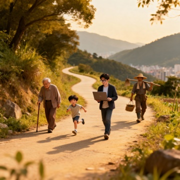 实景感与光影交织,质朴山径上四代人同行,融合传统与现代,温馨清新中透出动漫风的治愈气息,展现自然与人文的和谐共生。 寓意:修行之路人人可走,形式不同,方向一致