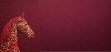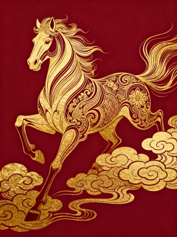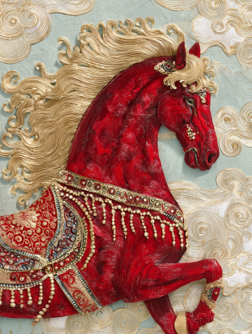工笔浮雕风红马,鎏金鬃毛飘逸,刺绣纹饰华美,金属质感厚重,尽显中式古典奢华与民族复古气韵。