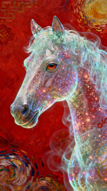 梦幻感与未来感交织的星空马,融合油画风与粒子风,厚涂技法呈现神秘唯美的虚拟自然,光影流动中透出科技感与体积感,背景红金漩涡呼应节日喜庆氛围。