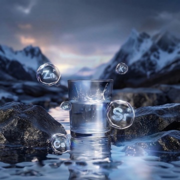 主体泡在波光粼粼、带有闪烁光点的淡蓝色水池里,以俯拍视角呈现,清新、水润的质感,采用写实的产品摄影风格。(产品包装是透明底)