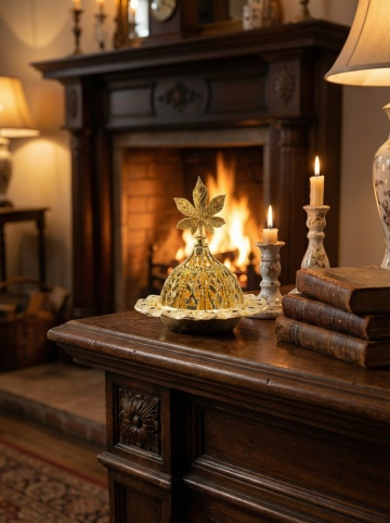 一张极具质感的餐桌特写,桌面上铺着一张精致的深蓝色亚麻桌布,边缘带有细微的白色刺绣花纹,桌布中央摆放着一个复古铜制烛台,三根蜡烛正散发着温暖的橘黄色光芒,烛台旁点缀着一小束新鲜的薰衣草花束,木质餐桌的自然纹理在柔和光线下清晰可见,桌面光滑有光泽,能映出周围环境的朦胧倒影。背景是一个优雅的欧式餐厅环境,柔和的暖黄色灯光从头顶的铁艺吊灯洒下,远处有模糊的拱形窗户,透进些许自然光线,窗边摆放着绿色的盆栽植物,整体氛围温馨而浪漫,具有高度的真实感和细腻的材质表现,适合作为高档餐厅或家庭聚餐的餐桌背景展示。
