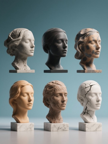 系列化艺术雕塑集合,6个造型各异的女性头部半身像,保持相同的抽象流动感面部设计和大理石底座,第一个雕塑粗糙的质感,第二个暗沉的质感,第三个有斑点,第四个有皱纹,第五个有裂痕,每个雕塑拥有独特的纯色背景与主体色彩,呈现现代极简主义风格,高细节3D渲染,柔和光影,规整网格排布,统一的构图与氛围,彰显雕塑的细腻纹理与优雅线条。