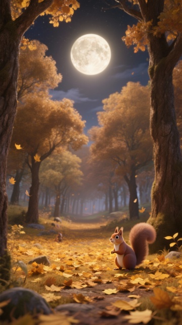 插画风与3D结合,梦幻光影映照静谧湖面,金桂树在月光下绽放,唯美感与浪漫感交织,虚拟自然中的中秋意境。