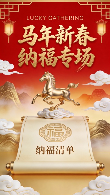 主体围绕鎏金琉璃马展开:骏马以鎏金嵌琉璃质感呈现,口衔焕新礼盒,立于带有梅花纹样的中式琉璃花窗前,花窗旁摆放新春绿植与福袋,背景是红金渐变的淡雾山峦,既贴合马年生肖属性,又强化 “新春焕新” 的活动核心。