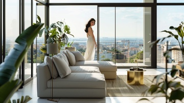 现代简约风格室内场景,不同角度和布置的大窗户,窗外是蓝天白云下的城市与绿色树林景观,窗台上摆放着绿植盆栽、透明玻璃杯和书籍,室内有白色懒人沙发、浅色地毯和木质小桌,温暖的自然光透过窗户洒入,光影柔和,色调以白色、浅木色和自然绿色为主,整体氛围明亮、宁静、舒适,展现不同窗户设计在空间中的布局与采光效果,突出窗景与室内陈设的和谐统一。