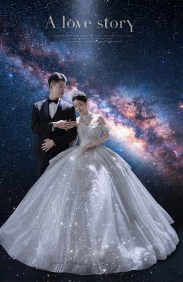 银河星系浪漫背景、圆月、星星点缀,帅哥抱着花与仙女妆美女面对面站在桥上,头顶有两只鹊盘旋。