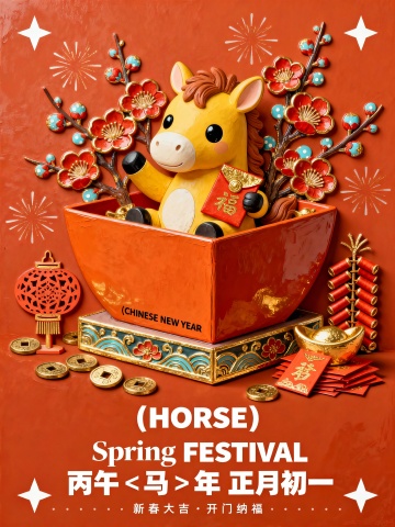红金双色碰撞,国潮剪纸风勾勒祥云灯笼,以“福”字堆叠成马形超级符号,鎏金质感尽显喜庆中式韵味,新春祝福跃然纸上。