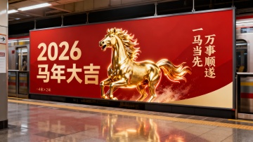 鎏金浮雕骏马跃动,中式古典山水卷轴铺陈,3D重拟物风呈现喜庆奢华,金属质感闪耀2026马年吉祥。