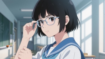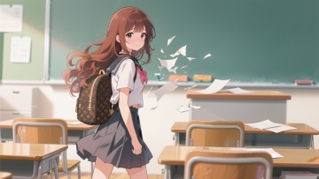 背面:长卷发及腰,校服裙摆有刻意整理的褶皱,背包为名牌款式(突出利己),步伐带优越感,背景是教室前排(学霸专属座位),精致感,伪善气质