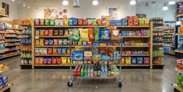 写实风格超市购物场景,两位女性朋友并肩行走的背影,金发女性穿着白色上衣和条纹阔腿裤,背着黄色双肩包,手持多个购物袋;黑发女性穿着白色上衣和橙色长裤,手持棕色手拿包和多个购物袋,两人手臂相挽,姿态亲密自然。超市内部宽敞明亮,顶部有现代感的弧形设计和嵌入式灯光,地面光滑反光,背景中可见货架、商品和模糊的其他顾客,整体色调以暖黄色和白色为主,光线柔和,营造出轻松愉快的购物氛围,视觉层次分明,主体人物突出,背景细节丰富,符合购物场景的真实感和生活气息。
