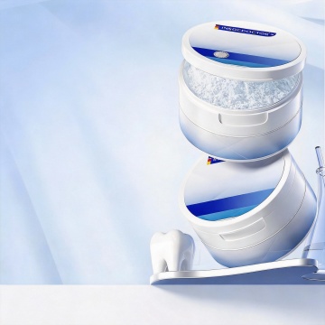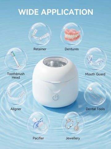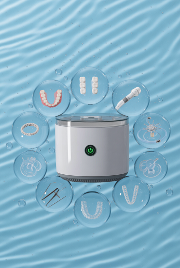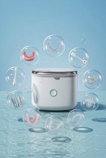 超写实3D渲染,特写镜头,牙刷正在清洁牙齿,白色牙刷毛接触洁白牙齿表面,周围飞溅着晶莹剔透的水珠,牙齿根部牙龈呈现健康的淡粉色,表面带有细腻的泡沫质感,背景为纯净的淡紫色渐变,整体光影柔和,高光清晰,阴影细节丰富,水珠具有真实的透明折射效果,画面干净清爽,传达专业口腔护理的洁净感与科技感。