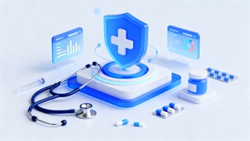 未来感医疗场景,科技蓝主调,3D轻拟物设计,玻璃质感与虚拟界面融合,展现智能健康防护概念。