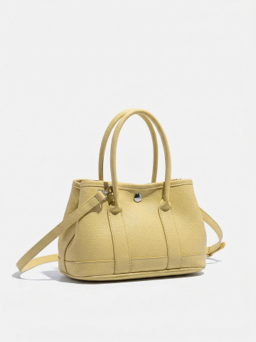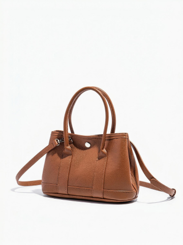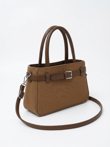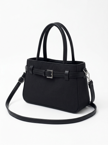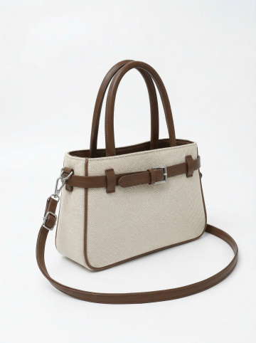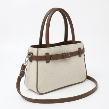 高质感产品摄影风格,极简主义设计,纯浅灰色背景,柔和均匀的顶光照明,清晰的阴影细节,一只女性的手(肤色自然,指甲修剪整齐,姿态自然放松)从上方握持着手提袋的提手,手提袋主体为白色帆布材质,具有细腻的纹理和轻微的褶皱感,变换为带有简约皮革拼接装饰的款式,提手设计为宽扁的皮革材质并与袋身形成对比色拼接,袋身正面有精致的压纹品牌标识,整体保持干净利落的线条和高级感,构图居中对称,画面纯净无其他元素,突出手提袋的设计细节和材质质感,达到商业产品宣传级别的视觉呈现。