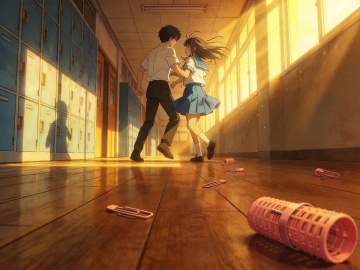 清新卡通风格,动漫风校园场景,少女轻拍男生肩头,阳光洒入教室,营造温馨互动氛围。