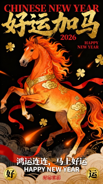 主标题上方:弧形浅米色小字 “BLESSINGS IN THE YEAR OF THE HORSE”
