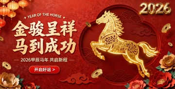 喜庆红金配色,剪纸与浮雕结合的鎏金骏马,国潮风韵十足,点缀祥云、灯笼与牡丹,传递2026甲辰马年吉祥祝福。