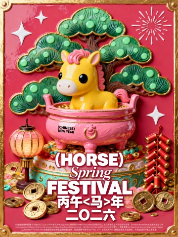 1、粉色的招财鼎承载的新春场景中:小马两只前蹄抱着一副红底金字春联,嘴角微微上扬,它身后簇拥着表面带浅绿色波点的风格化绿色松树,招财鼎底座下摆放着烫金灯笼、方孔铜钱、炮竹与一张倒福字。