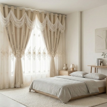 两张垂直悬挂的窗帘,安装在深棕色金属杆上,窗帘布料呈现柔软的垂坠感,表面有细腻的褶皱纹理,左侧窗帘为米杏色,右侧窗帘为浅米白色,右侧窗帘局部有柔和的自然光照射形成渐变光影效果,整体画面简洁干净,背景为纯白色,突出窗帘的材质质感和色彩对比,展现出温馨、简约的居家氛围。