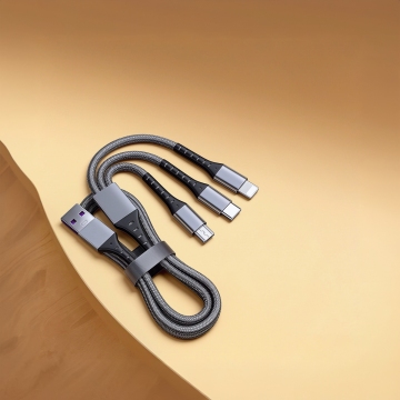 赛博朋克风格的智能手机充电场景,霓虹蓝与紫色渐变光效笼罩,手机屏幕显示动态赛博数据流图案,充电器和数据线呈现金属质感与霓虹灯带装饰,白色桌面转化为带有电路纹理的黑色高科技平台,背景墙变为布满全息投影广告和管线的未来都市夜景,整体光影对比强烈,充满未来科技感与机械美学,高细节,8K渲染,电影级构图