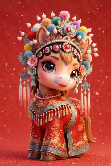 软3D风格的国潮小马,身着刺绣红袍,头戴华丽中式凤冠,融合拟人与卡通元素,喜庆可爱,尽显节日氛围。