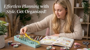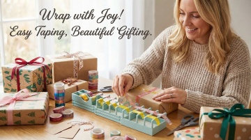 以图中的胶带切割器为元素,欧美女人使用胶带切割器,设计6张跟胶带切割器有关的图,物体主体特征不变,英语,比例 「16:9」