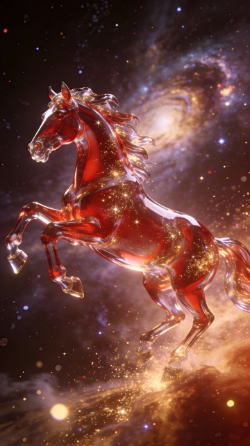 玻璃风透明红马跃于星河,光影流动,粒子闪烁,融合梦幻与神圣感,3D重拟物设计展现未来奢华之美。