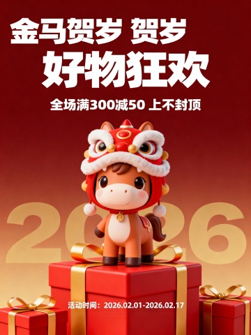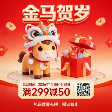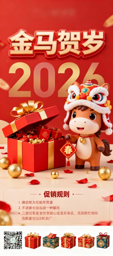 以大红色为背景,带有立体艺术字“金马贺岁”,搭配戴舞狮头套的3D卡通小马、装满礼品的红色礼盒,还有促销规则文字与微信二维码,整体风格喜庆热闹,充满新年氛围。