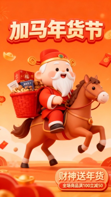 软3D国潮风,卡通财神骑马送年货,喜庆橙色背景,体积感十足,融入传统元素与现代设计,传递新春喜悦与促销信息。