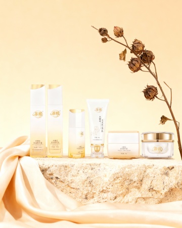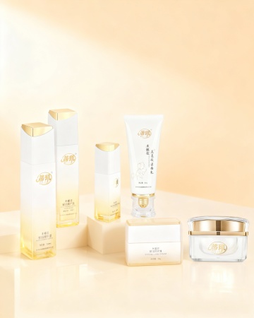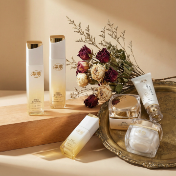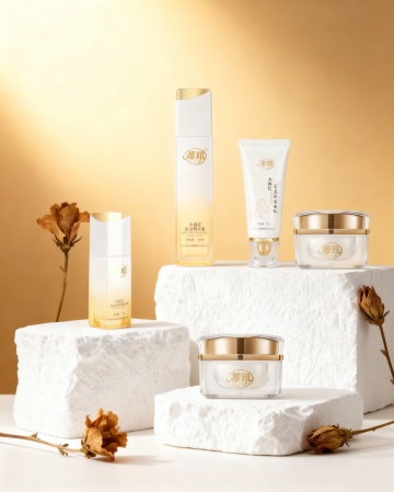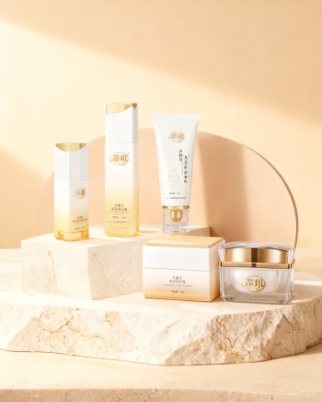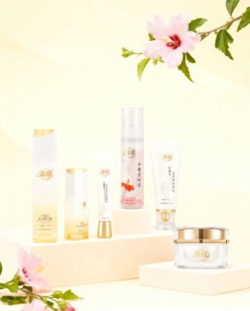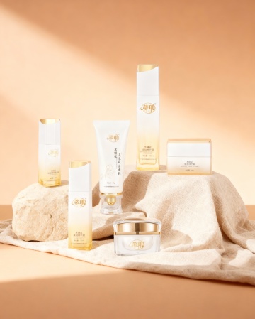 化妆品竖版宣传海报,整体采用清新透亮的蓝白渐变色调,柔和的水光感光影效果,呈现出干净清爽的氛围。海报顶部中央展示一款白色瓶装的护肤品(如精华液或乳液),瓶身设计简约现代,搭配白色花朵和水珠元素,突出产品的纯净与水润。产品下方分布四个蓝色圆形图标,分别配以“提亮美白”“温和清爽”“安心祛痘”“润滑保湿”等文字说明。中部区域展示产品适用人群的肌肤问题示意图,采用四宫格布局,分别呈现不同肌肤困扰的面部特写。下方以透明水泡和植物提取物微观图展示产品成分,突出“三重氨基酸表活”“植源表活科学复配”等核心卖点。再往下是三步功效说明,每个步骤配以圆形图标和简洁文字,分别为“净撤毛孔”“水油平衡”“舒缓补水”,并再次展示产品瓶身。底部为产品使用步骤示意图,四步流程以女性面部护理动作的图片呈现,最后以权威质检报告和产品信息表收尾,整体视觉层级清晰,信息传达高效,符合护肤品针对年轻女性受众的清新、科学、安全的宣传目的。