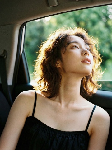 胶片风光影捕捉,柔和清透的自然光洒在卷发上,实景感十足的车内场景,文艺与时尚交织,唯美呈现夏日清新意境。