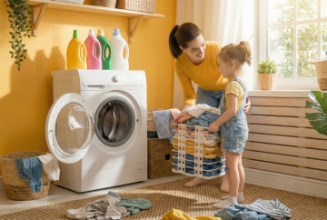 生成一个欧美女人在家里的洗衣服中使用产品(洗衣篮)