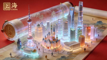 生成上海外滩主题插画,微缩立体场景,现代中式融合美学,一张巨大的织金画卷向远方延伸,画卷上立体的节庆盛景,有C4D珠光金属质感的东方明珠、鎏金金属立体的外滩钟楼、拉丝金属立体的陆家嘴天际线、金属雕花立体的老码头、镜面金属立体的黄浦江轮渡,高铁穿梭于城市天际、无人机编队组成“上海”字样掠过。金粉渐变丝带缠绕地标,细节融入科技感金属纹路与节庆灯笼元素,金属表面反射节庆灯光与江面波光,高光柔和且质感细腻,强化C4D材质的精致度与氛围感。生成5张
