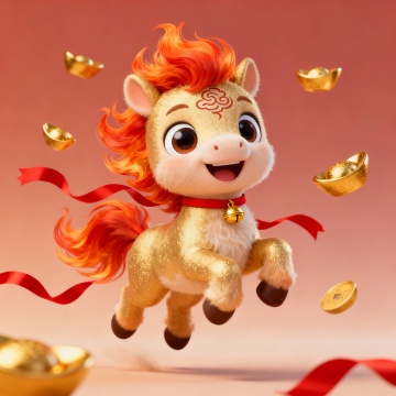 3D卡通小马拟人化设计,毛发生长细腻生动,鎏金文字喜庆跃动,红底衬托吉祥氛围,传递新春好运祝福。