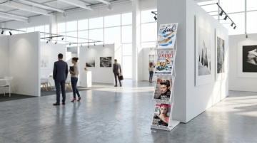 一个大型的空白灯箱广告,安装在灰色的石材外墙上,灯箱有银色的边框,灯箱内部是纯白色的。灯箱的右侧有一些黄色的树叶,一个穿着深色外套的人正从灯箱的左侧走过,人物有些模糊,营造出一种动态的感觉。整个画面采用了写实的摄影风格,光线柔和,阴影清晰,色调以灰色和白色为主,营造出一种现代、简约的氛围。