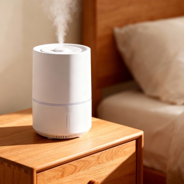 简约主义风格,性冷淡风设计,轻拟物形态的加湿器置于木质床头柜上,柔和光线营造舒适温馨实景感,蒸汽轻盈升腾,传递宁静生活氛围。