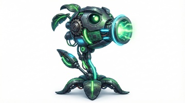 以这个植物角色为原型,生成不同变异的风格的进阶形态,分别是暗黑、寒冰、烈火、剧毒、赛博、复古的风格,白色背景,横版