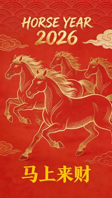 国潮风描边浮雕设计,鎏金群马奔腾于红底祥云间,喜庆中式年味浓。