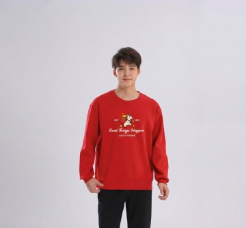 国潮风新年写真,红毛衣搭配传统春联,温暖实景中传递喜庆与温馨,面料质感细腻,中式年味十足。